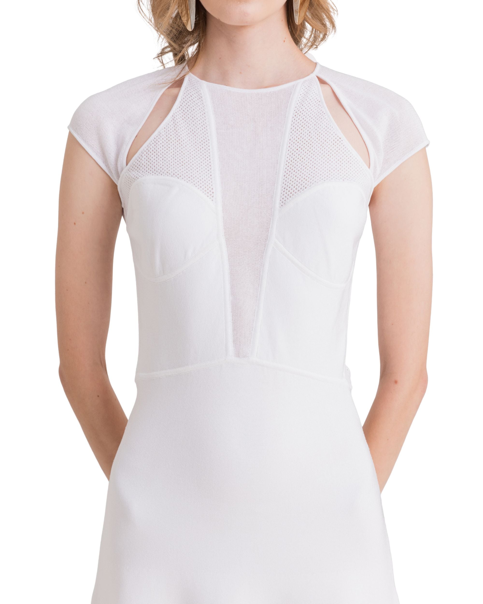 فستان ميدي محيك يتميز بفتحات عند الأكتاف وظهر مفتوح، مع قصة واسعة تضيف لمسة أنثوية جذابة.